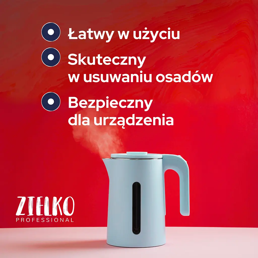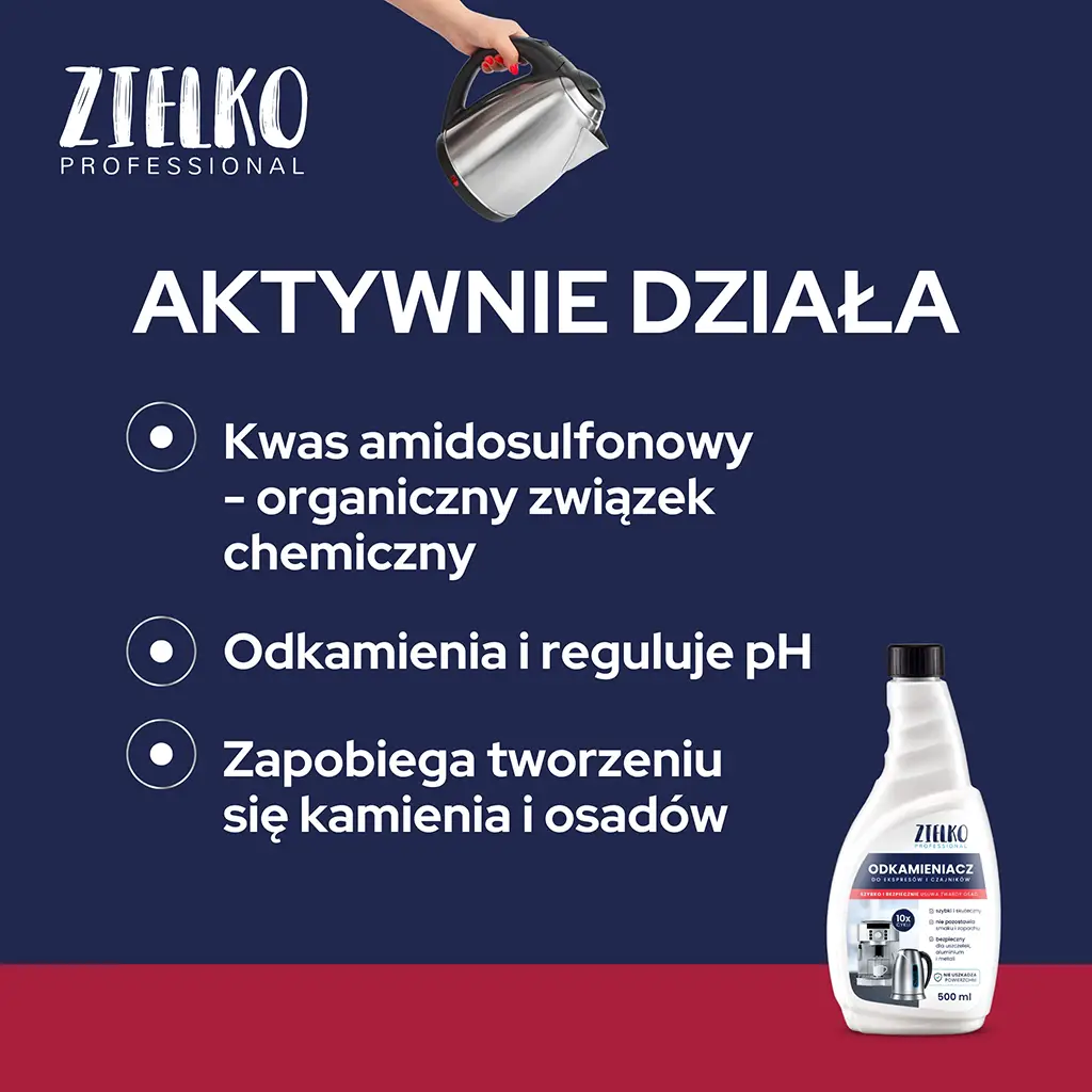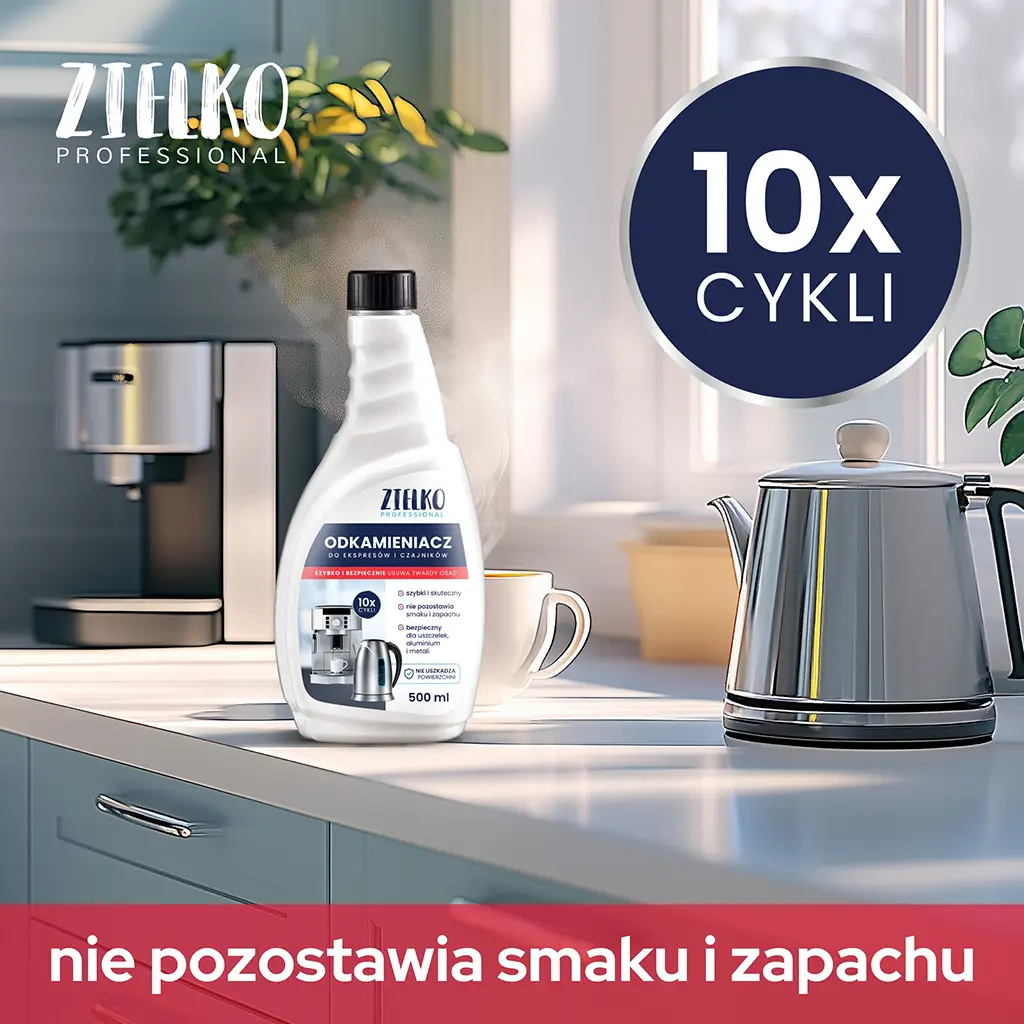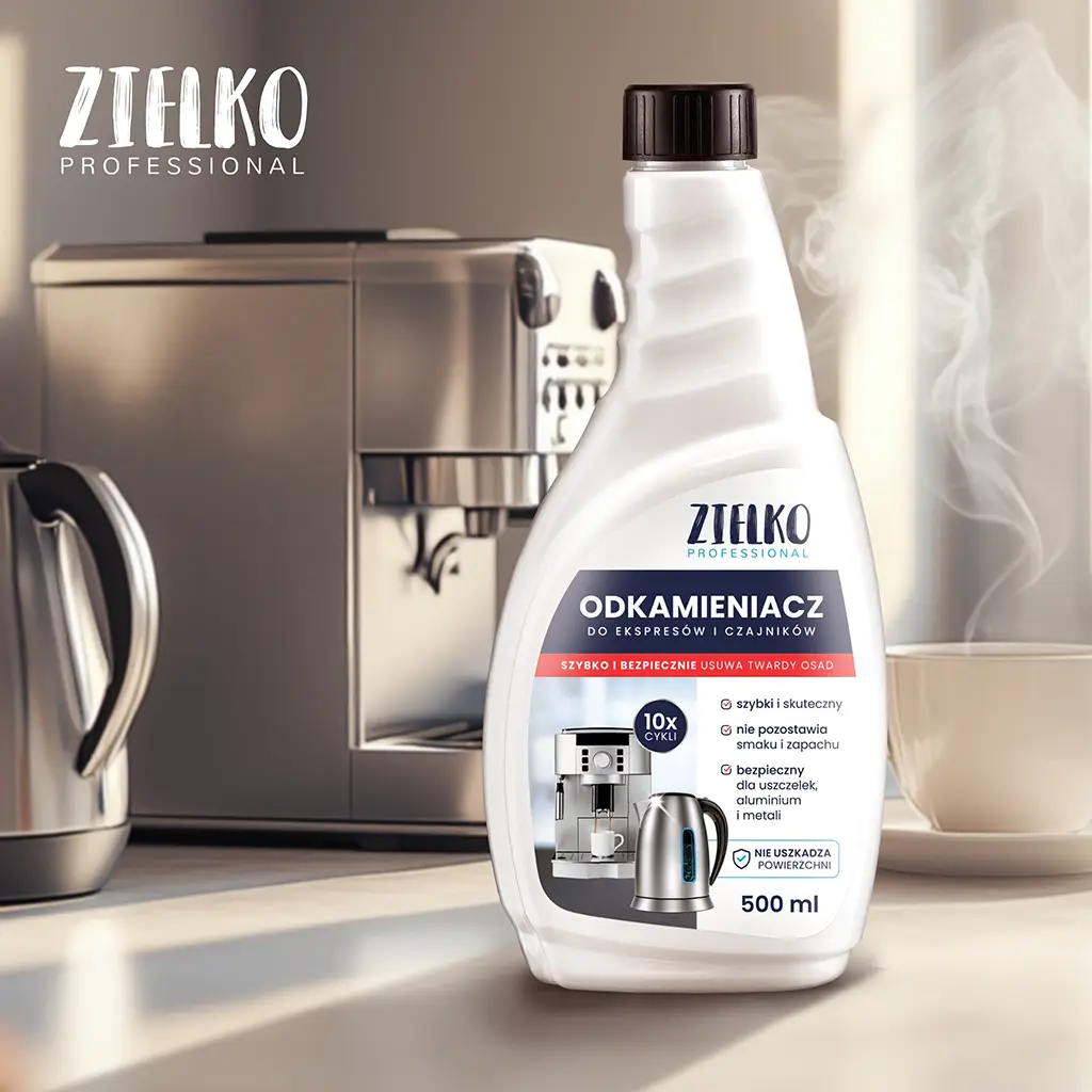 ZIELKO Odkamieniacz to niezawodny preparat stworzony do skutecznego usuwania osadów kamienia z ekspresów do kawy i czajników.