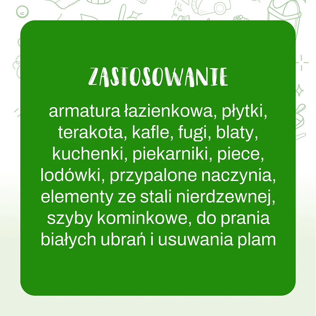 Zastosowanie: armatura łazienkowa, płytki, terakota, kafle, fugi, blaty, kuchenki, piekarniki, piece, lodówki, przypalone naczynia, elementy ze stali nierdzewnej, szyby kominkowe; do prania białych ubrań i usuwania plam.