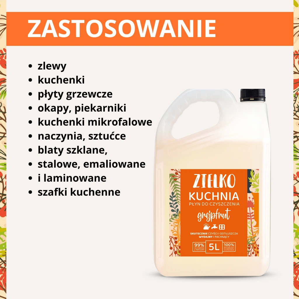 Ekologiczny płyn do kuchni ZIELKO o energetyzującym zapachu grejpfruta to niezastąpiony pomocnik w codziennym sprzątaniu. Dzięki starannie opracowanej formule skutecznie usuwa tłuszcz, osady i przypalone zabrudzenia – bez potrzeby intensywnego szorowania. Czyszczenie staje się prostsze i bardziej komfortowe. Płyn zapewnia perfekcyjną czystość, nie pozostawiając smug ani zacieków na żadnej z powierzchni. Jego naturalny skład jest w pełni bezpieczny dla miejsc mających kontakt z żywnością, co czyni go idealnym wyborem dla osób ceniących zdrowie i bezpieczeństwo bliskich. Dodatkowo produkt jest bardzo wydajny – już niewielka ilość wystarczy, by uporać się nawet z trudnymi zabrudzeniami. Świeży aromat grejpfruta na długo unosi się w powietrzu, dając uczucie czystości i orzeźwienia. ZIELKO uczyni codzienne porządki w kuchni szybkim i przyjemnym rytuałem.