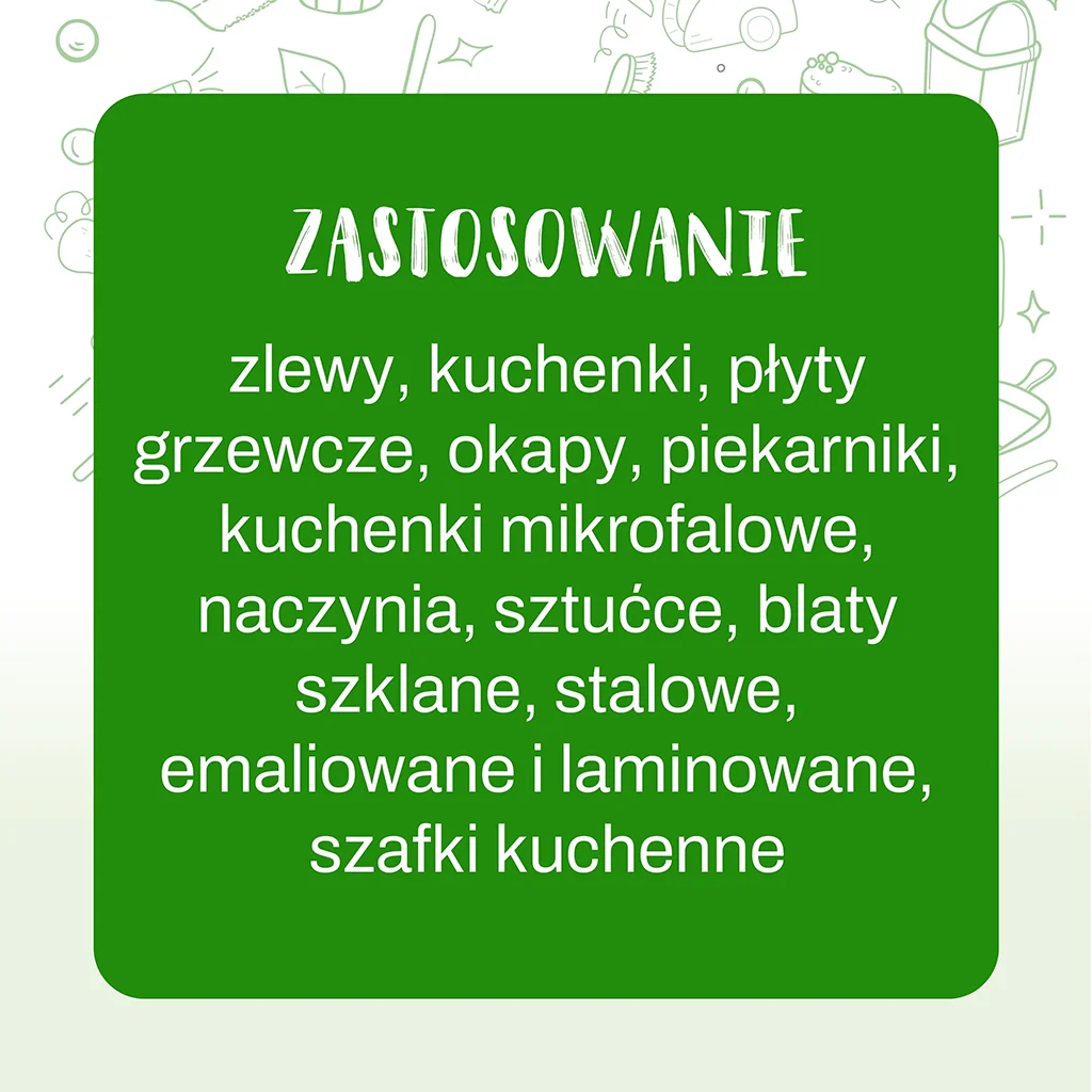Zastosowanie: zlewy, kuchenki, płyty grzewcze, okapy, piekarniki, kuchenki mikrofalowe, naczynia, sztućce, powierzchnie / blaty szklane, stalowe, emaliowane i laminowane, szafki kuchenne.