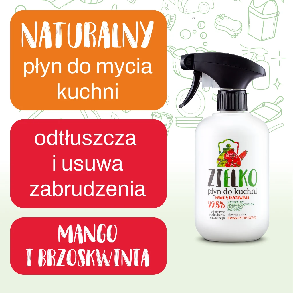 Naturalny płyn skutecznie odtłuszcza i czyści nawet najbardziej oporne kuchenne zabrudzenia z każdej powierzchni. Bezpiecznie, bez smug i zacieków. Wystarczy spryskać preparatem czyszczoną powierzchnię i po kilku chwilach przetrzeć wilgotnym ręcznikiem.