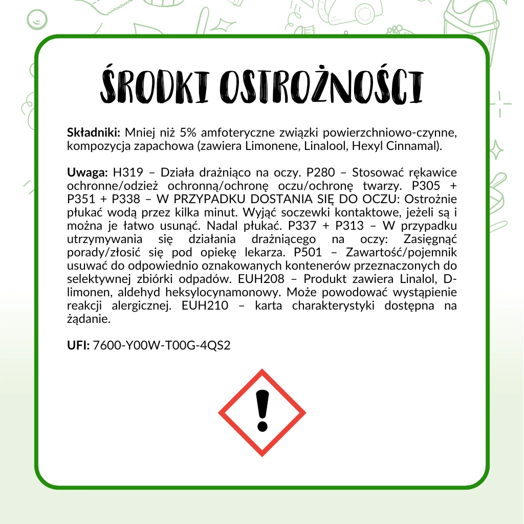 Składniki: Mniej niż 5% amfoteryczne związki powierzchniowo czynne, kompozycja zapachowa (zawiera: Limonene, Linalool, Hexyl Cinnamal).