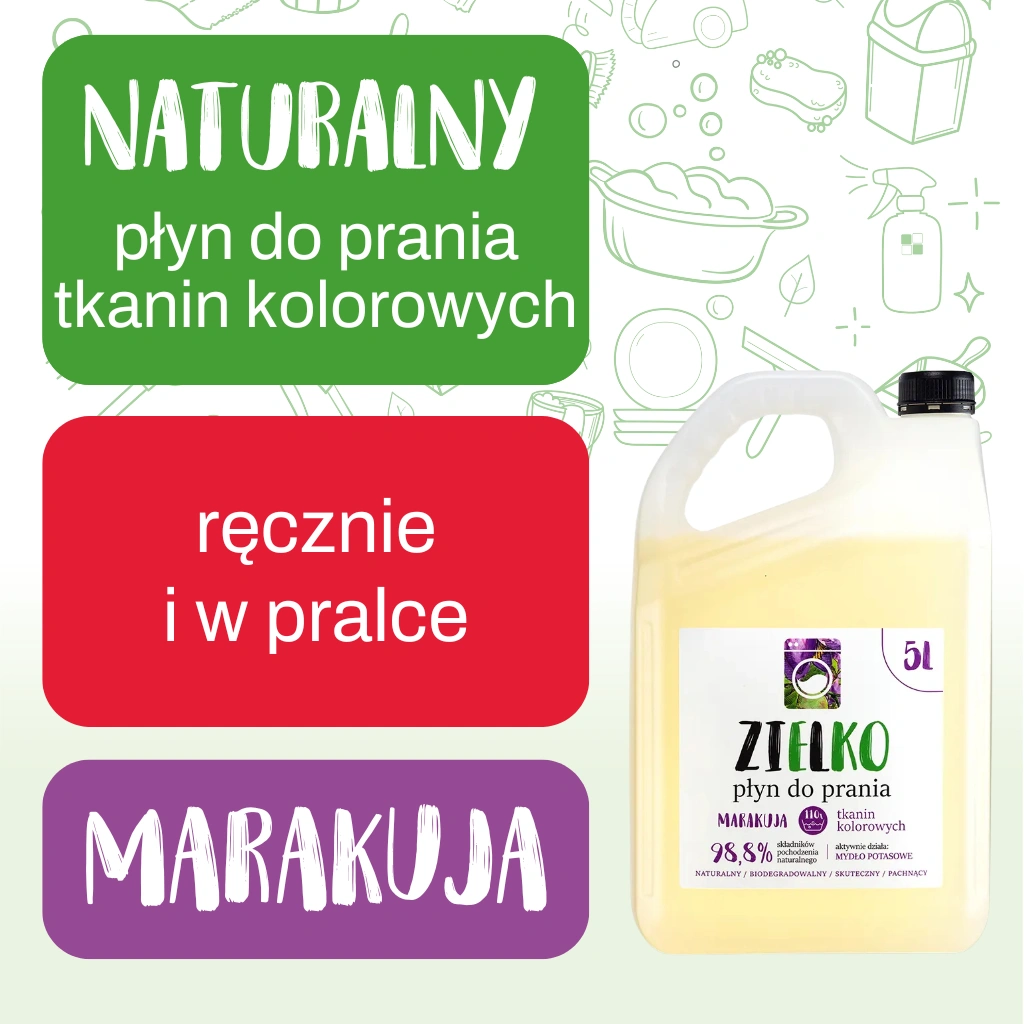 Naturalny płyn na bazie mydła potasowego dedykowany do prania tkanin kolorowych o zapachu marakui. Sprawdzona receptura oraz ekologiczny skład płynu pomagają usuwać plamy, nie niszcząc tkaniny. Został stworzony do stosowania zarówno podczas prania ręcznego oraz w pralce. Sprawia, że ubrania stają się czyste i przyjemne w dotyku. Skuteczne pranie w temperaturze 30°- 60°C.