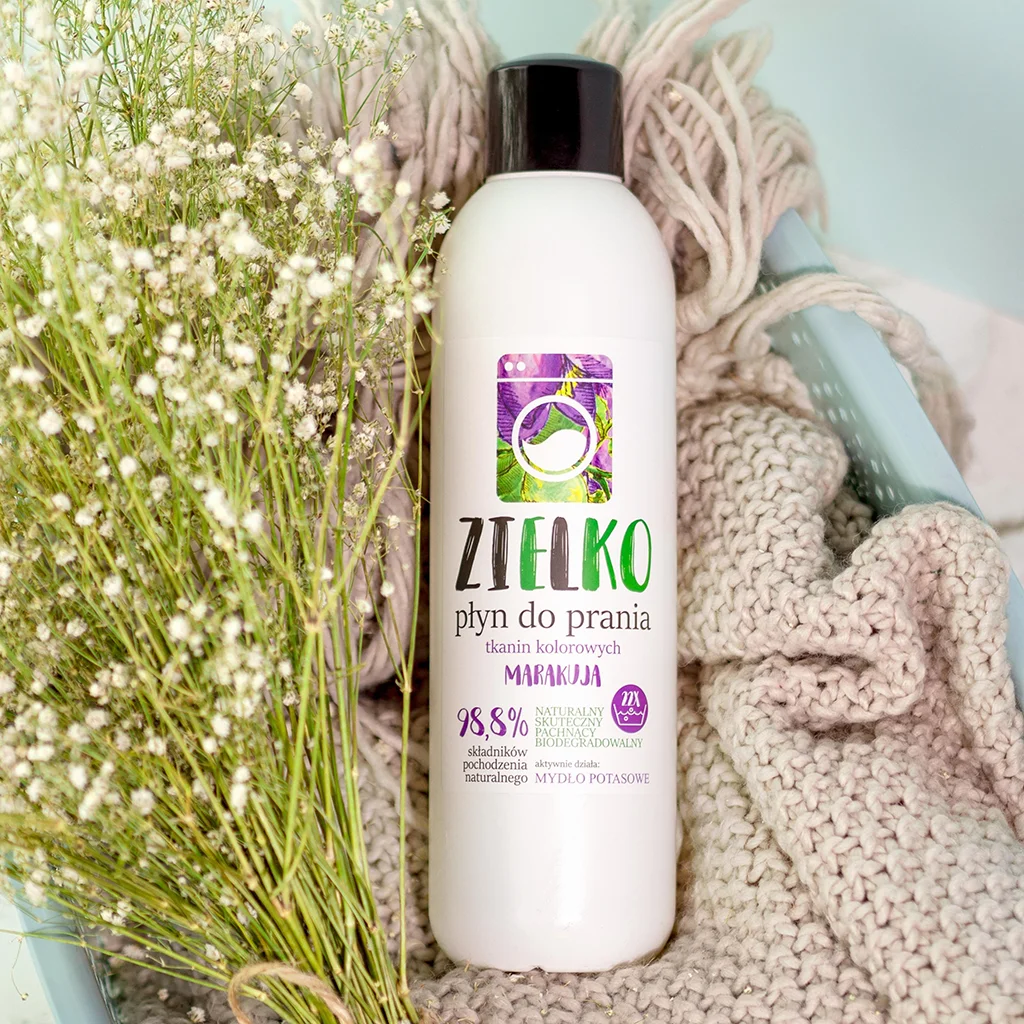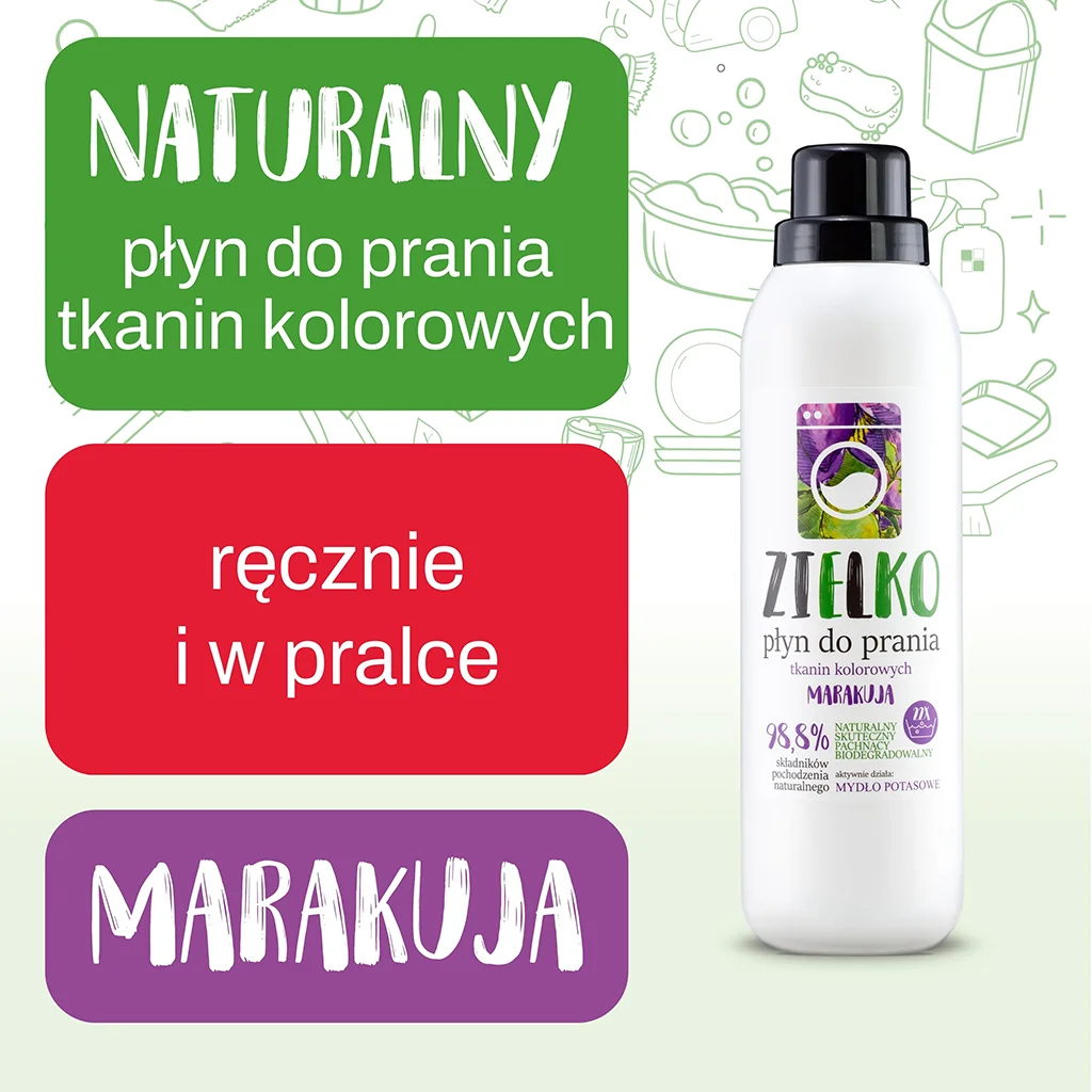 Naturalny płyn na bazie mydła potasowego dedykowany do prania tkanin kolorowych o zapachu marakui. Sprawdzona receptura oraz ekologiczny skład płynu pomagają usuwać plamy, nie niszcząc tkaniny. Został stworzony do stosowania zarówno podczas prania ręcznego oraz w pralce. Sprawia, że ubrania stają się czyste i przyjemne w dotyku. Skuteczne pranie w temperaturze 30°- 60°C.