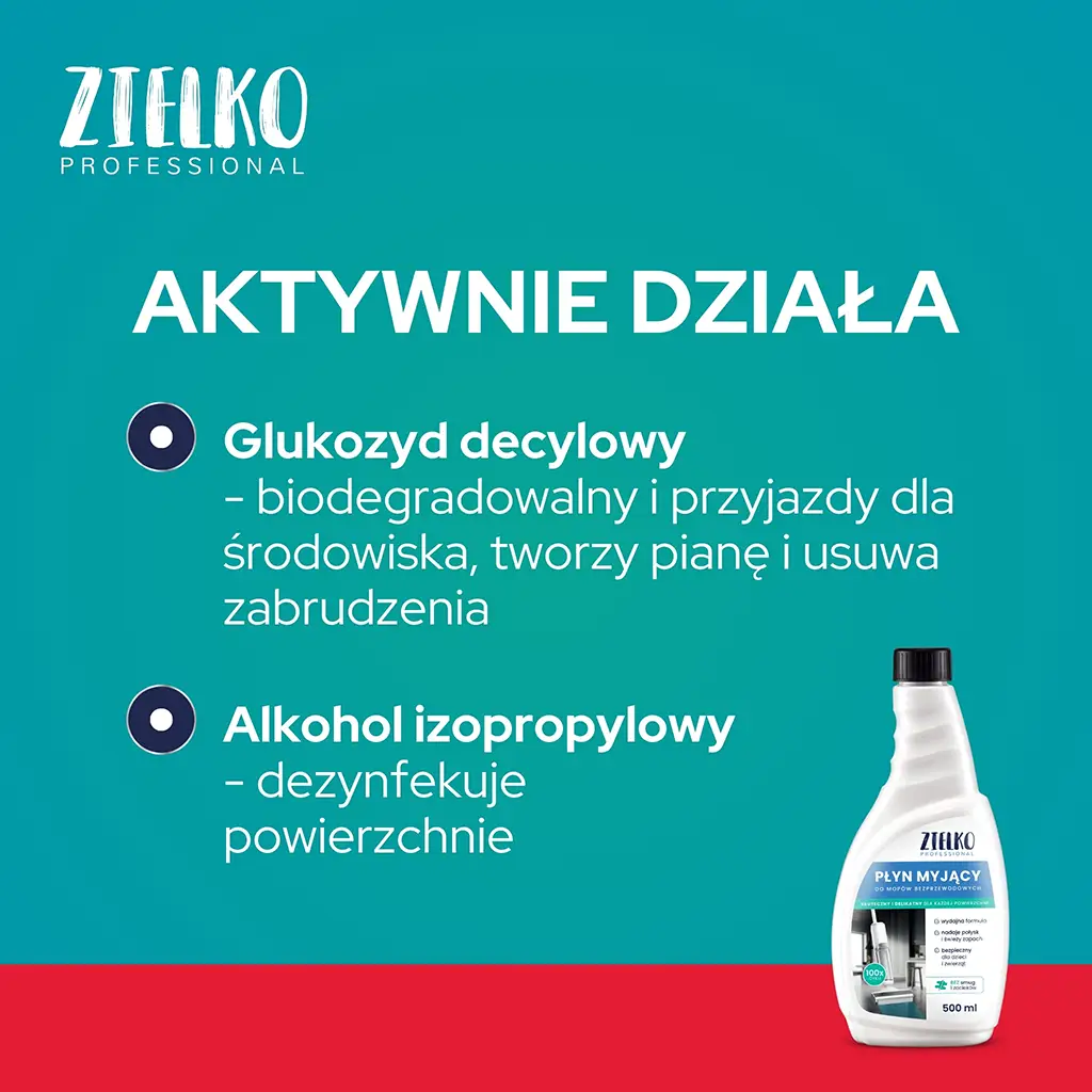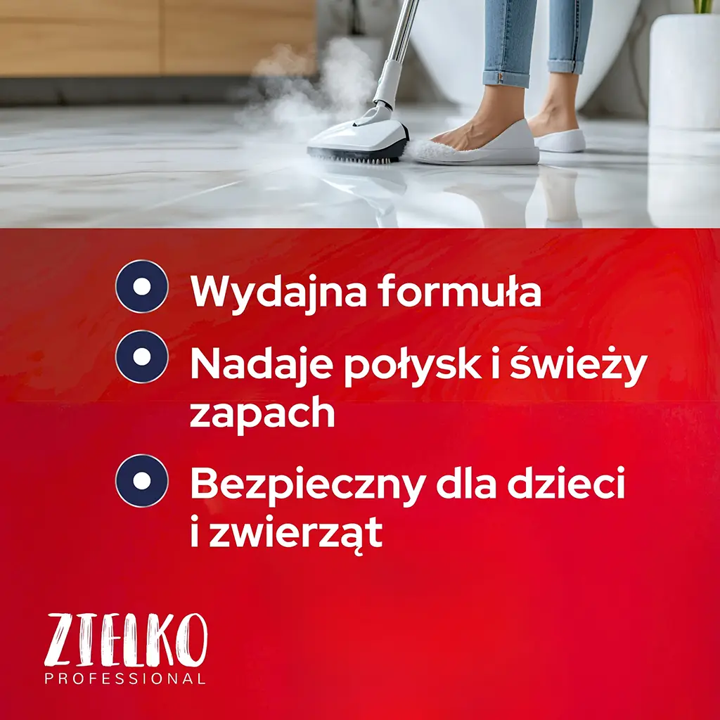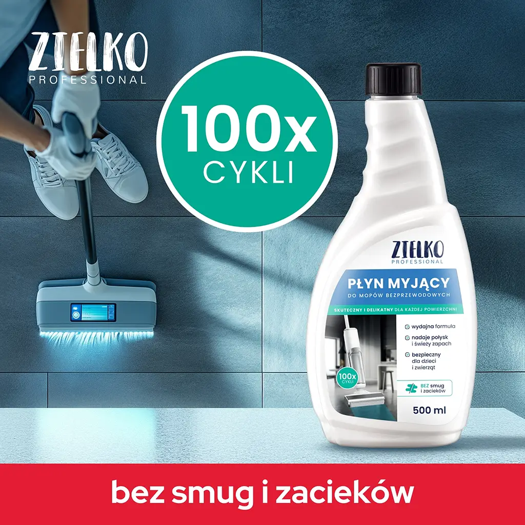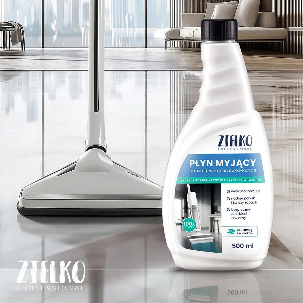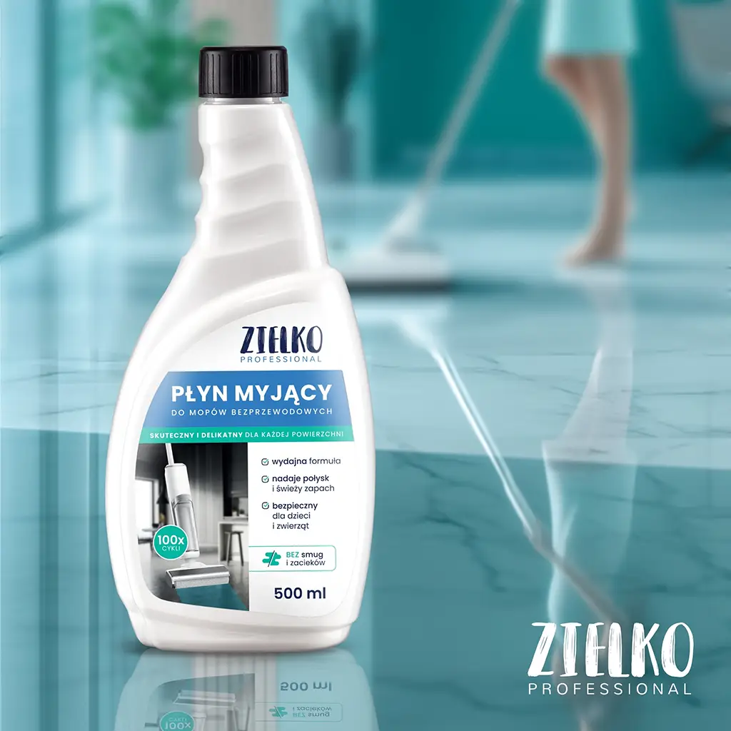 ZIELKO Professional Płyn myjący do mopów bezprzewodowych to niezawodny preparat stworzony specjalnie do użytku z urządzeniami bezprzewodowymi. Dzięki niskopiennej formule skutecznie usuwa zabrudzenia, plamy oraz tłuste ślady, pozostawiając podłogi idealnie czyste – bez smug i zacieków.